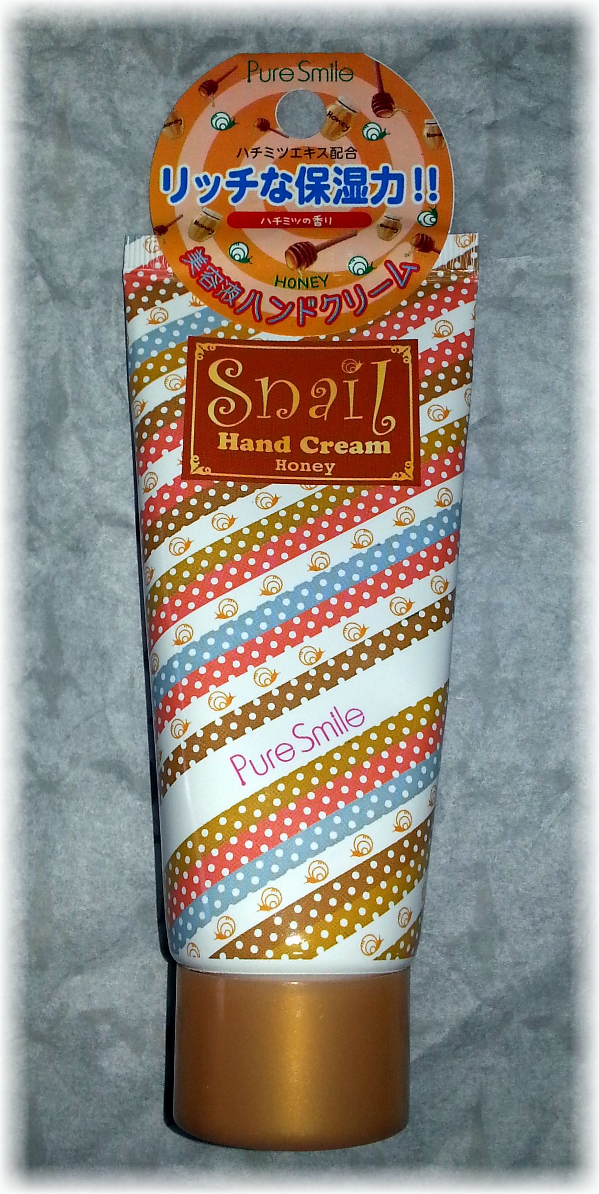 Pure Smile Honey Snail Hand Cream What is this – a Honey box or a Snail Slime box? 😀 Now, in my previous review of the Green Tea box, I dismissed the Hello Kitty hand cream, but this one, I don’t think I will. Since mucin has such restorative properties and my hands get cut up and bruised (don’t ask – I am clumsy and paper cuts are killers), I am interested in seeing if this helps with the healing time on my hands. This is a lightweight lotion, so I can use it now, during the hot, humid summer months. Full size 60gram value $5.00
