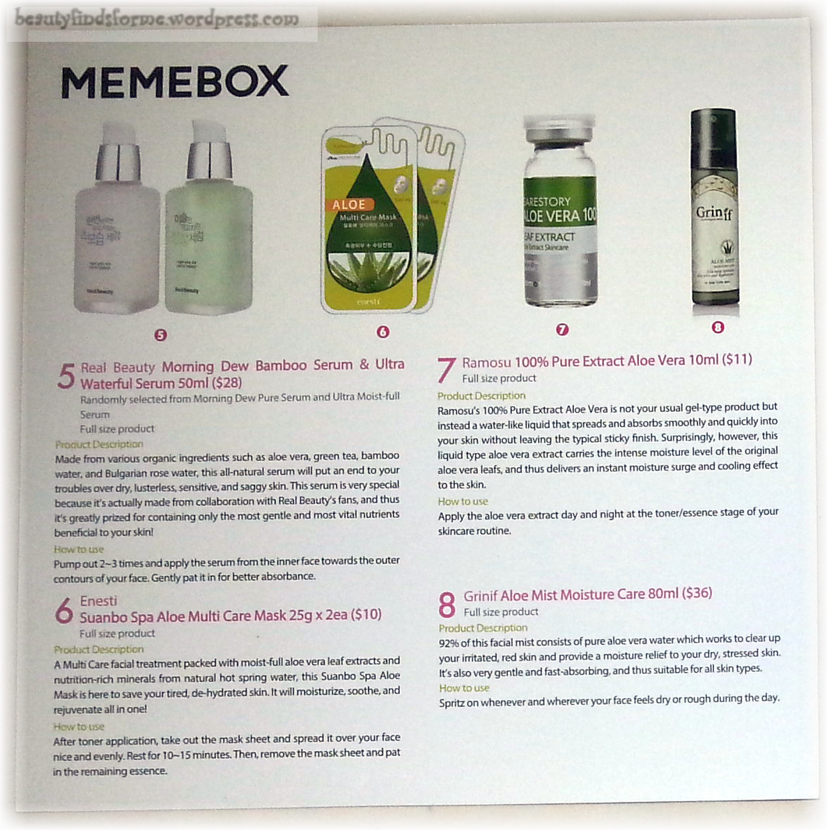 4. I used my memebox credit to purchase this box thanks to your review. I LOVE using aloe vera and have greatly enjoyed these products. I do reviews of sub boxes I review, but am not doing them for Memeboxes. I am cutting back on beauty boxes and am going towards some unique boxes that are coming out in the next month. I am sending all of my readers to YOU though thanks to your thoroughness and obvious love of Memebox. I hope it brings you some more credits along the way! Greatly enjoying your blog!!