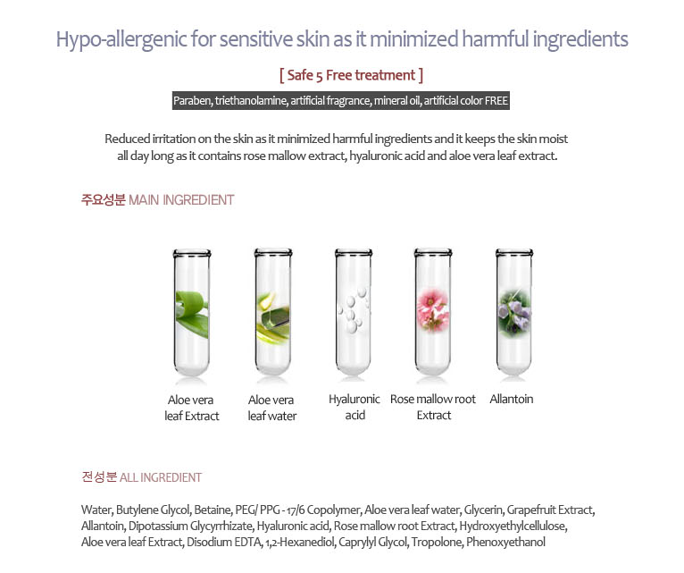 Ingredients: 92.5% of aloe vera water, instead of using purified water, soothes and clears the skin. The moisturizing ingredients such as hyaluronic acid, rose mallow(hollyhock) extract and betaince keep the skin soft and supple.