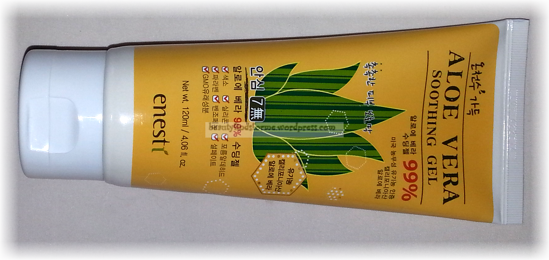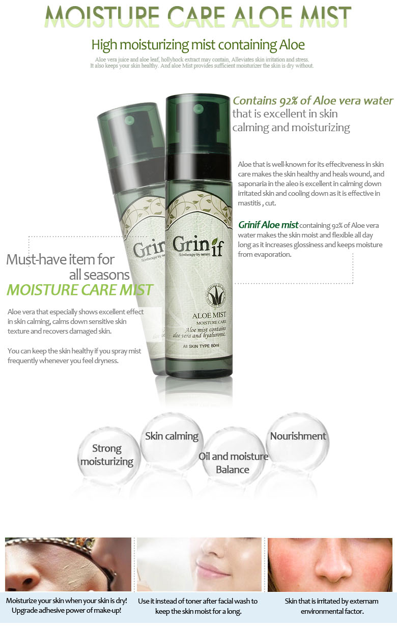 Product Description: This soothing gel is enriched with not only aloe vera, green tea, chamomile and rosemary extracts but also natural hot spring water from Korea carrying more than 15 naturally derived minerals and nutrients.  Also, aloe vera gel is very effective in treating redness, blemishes and acne scars on your skin