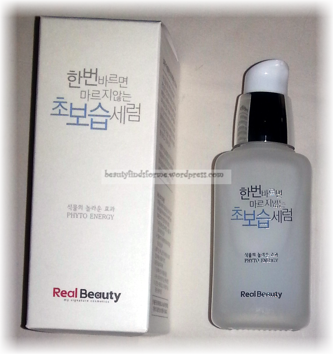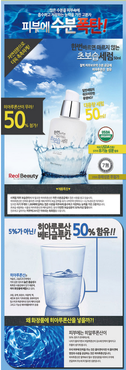 Real Beauty (Real Skin) Ultra Waterfall Serum  I am assuming that I have the Ultra Waterfall Serum (Ultra Moist) as my bottle is an frosted white with blue lettering ~ unlike the Morning Dew Bamboo Serum, which is a greenish bottle with green lettering.  I am going by color here! HA!  I also found this item on realskin.kr and based on the pictures with all of the gushing water, I have to think this is what I got.  Not to mention that the Korean to English translation of this product is “Once paint is not dry super moisturizing serum”  That reads like a beautiful haiku 🙂
