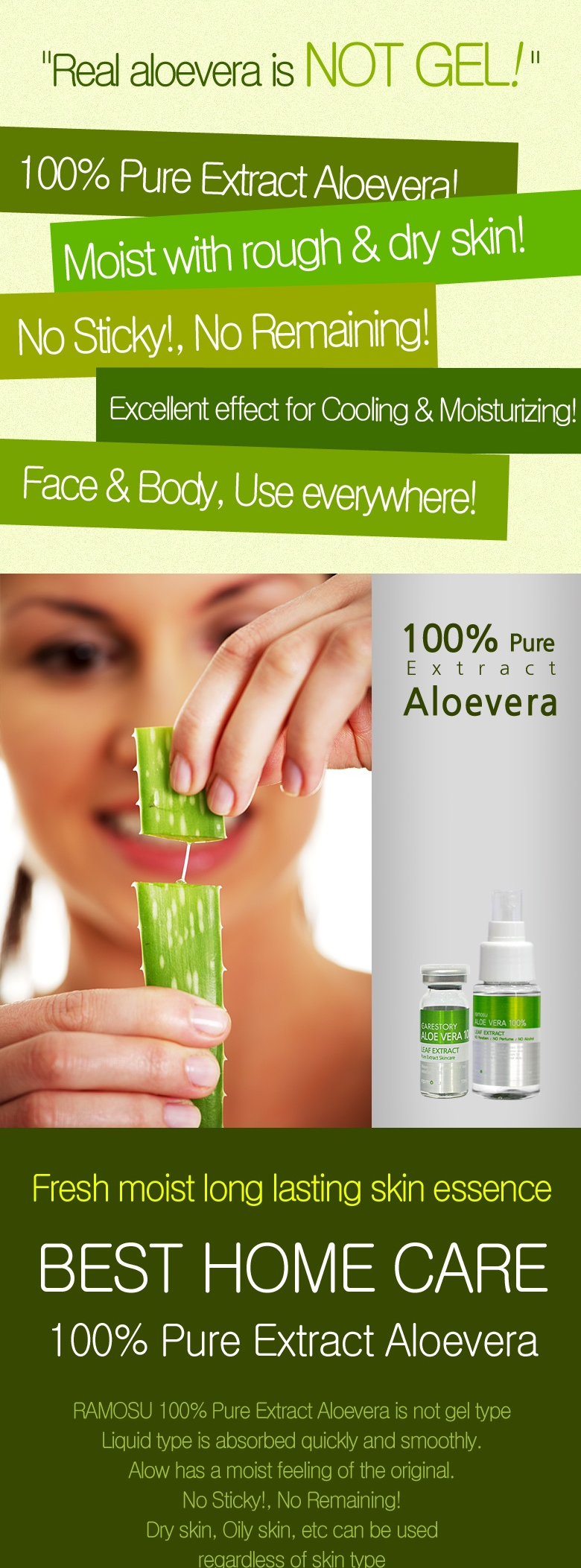 Product Description:  Ramosu’s 100% Pure Extract Aloe Vera is not your usual gel-type product but instead a water-like liquid that spreads and absorbs smoothly and quickly into your skin without leaving the typical sticky finish.  Surprising, however, this liquid type aloe vera extract carries the intense moisture level of the original aloe vera leafs and thus delivers an instant moisture surge and cooling effect to the skin