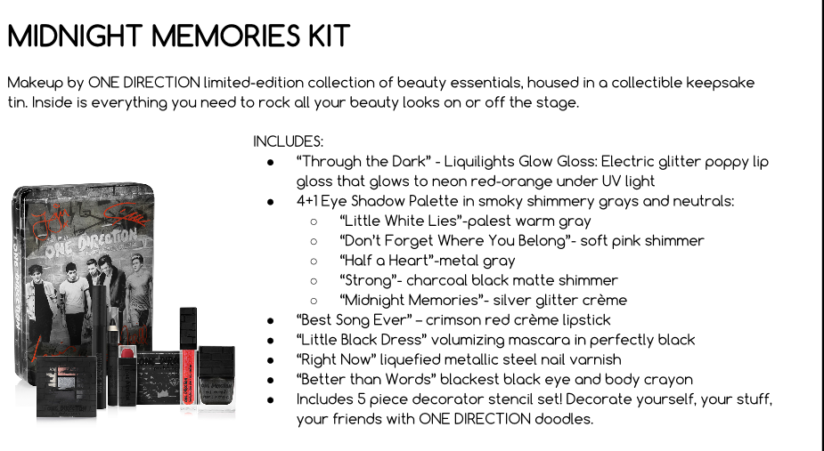 For even more information, please check out http://www.facebook.com/MakeupbyOneDirection