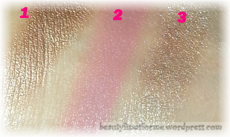 Swatches with flash: (1) Tan Glow Eyeshadow (2) Roseate Lip Pencil (3) Oracle Kohl Eye Pencil