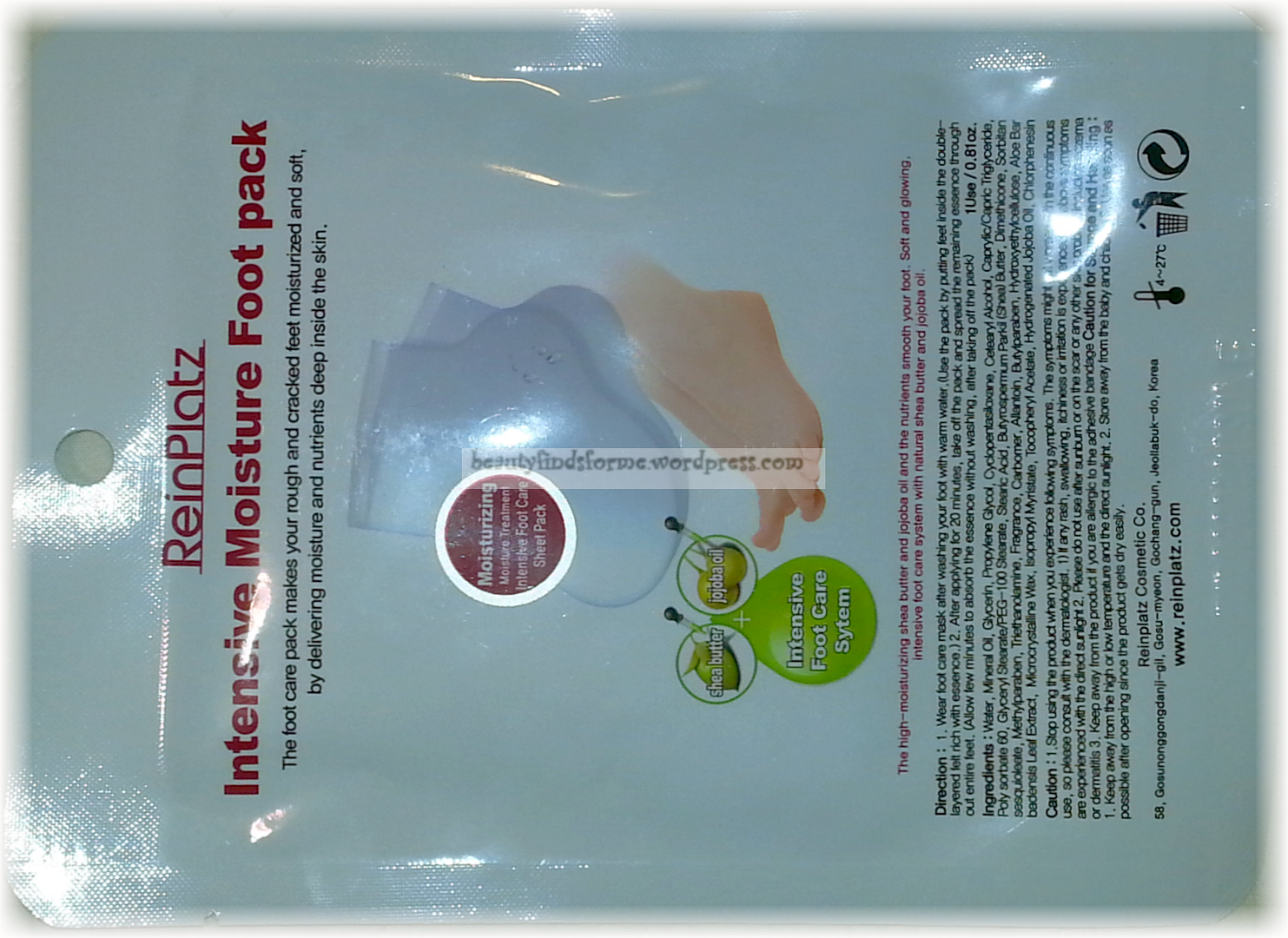 ReinPlatz Intensive Moisture Pack Randomly selected from Hand Pack, Foot Pack.   I received the Foot Pack, which is the one I really wanted.  Hand packs are fine, but well, you know, my feet.  I love my feet.  These are great ~ I have used both types of packs ~ not by this brand ~ and when they work, they really are super hydrating and moisturizing.   ReinPlaz  Foot pack is made with shea butter and jojoba oil.   I actually like to leave them on for an hour or more ~ When I am watching TV, I just put them on and keep them on until my show is over.    Full Size 23g Value $4.00