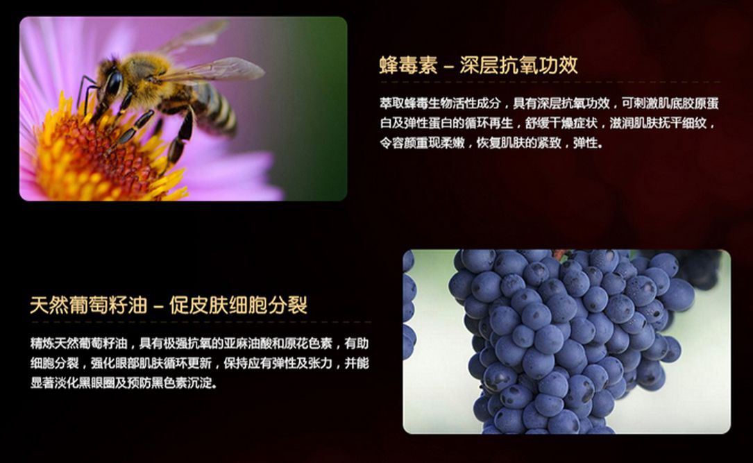 Product Description: Concentrated serum targets skin aging in the eye zone with a blend of bee venom and grape seed oil. Bee venom stimulates collagen and protein production to smooth out lines and wrinkles, while grape seed oil fortifies skin tissue and prevents melanin formation to lighten dark circles. Innovative syringe-type dispenser prevents oxidation to maintain serum efficacy and ensure a standard dose with every use.