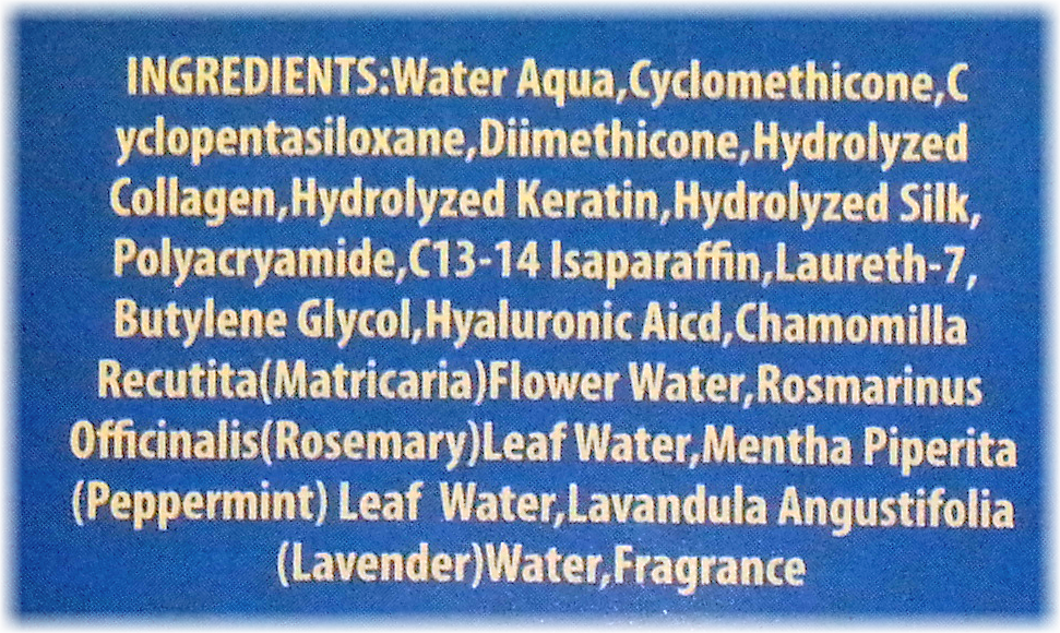 Ingredients: water,cyclopentasiloxane,glycerin, butylene clycol, peg-10 dimethicone/vinyl dimethicone crosspolymer, sodium chloride, dimethicone, phenoxyethanol, cetyl PEG/PPG 10/1 dimethicone, tocopheryl acetate, punica granatum extract(120mg), methylparaben, ethylparaben, betaine, fragrance,cl14700