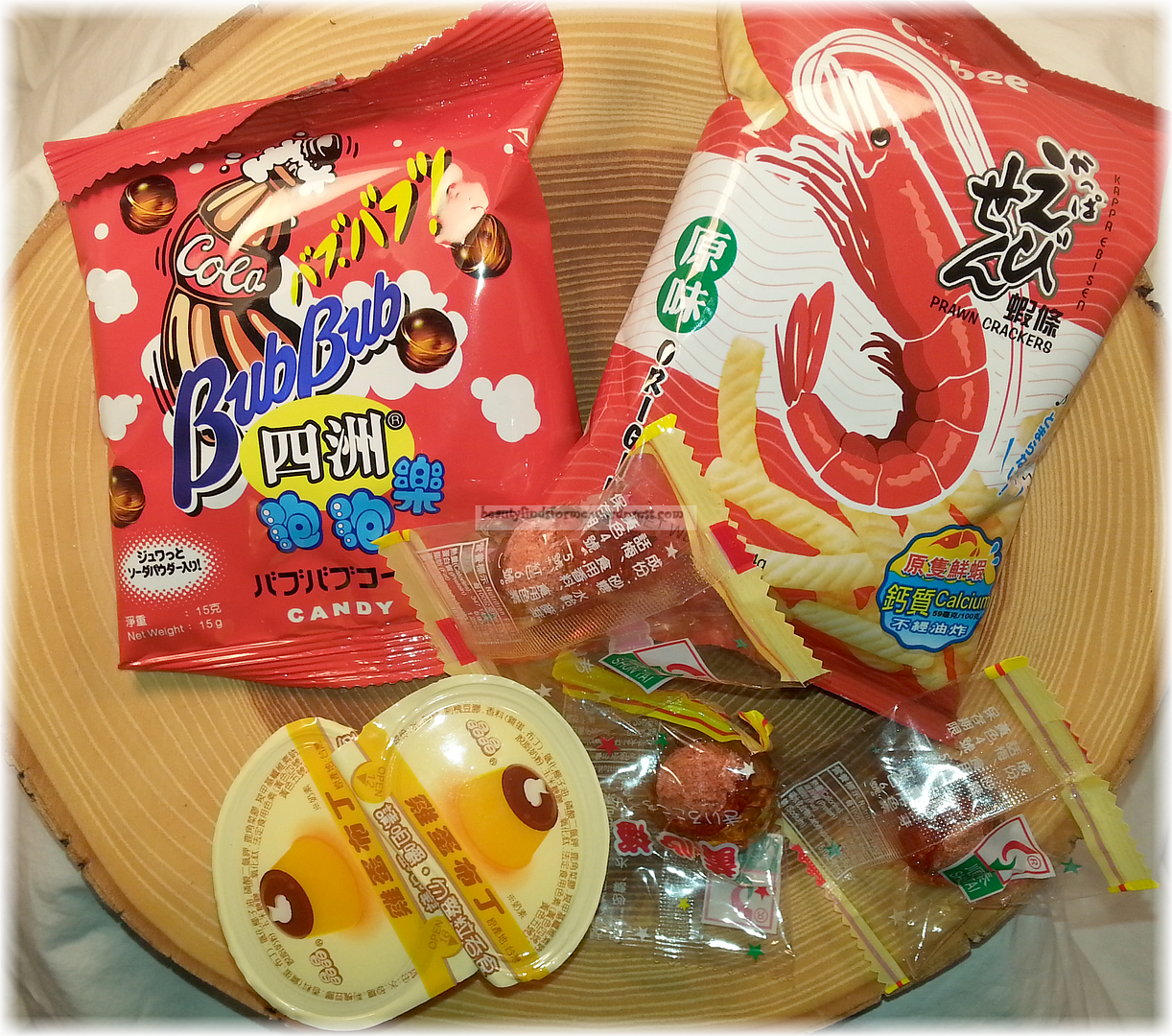 left to right, clockwise:: Bub Bub Cola candy, Prawn crackers, Plum Lollipop candy, Custard Jelly