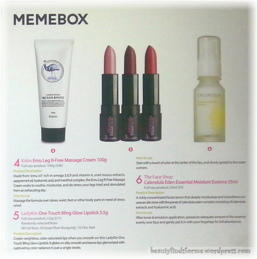 I actually enjoyed receiving this box. There are two items that I cannot use as I was either allergic to one of the ingredients ~ rose in the Hiello Blooming Cream ~ or it was for dry/sensitive skin ~ The Tang Tang Kissy Peeling cream. My only disappointment is that the Hiello cream was smashed beyond use and I am not sure how this could have happened. I can only assume this happened prior to the shipping stage, as my Memebox and its contents were not smashed, crushed or even dinged. I will really get good usage out of the Kskin Emu Leg Cream, the LadyKin lipstick is just beautiful and I love The Face Shop’s Calendula Eden line. The green correcting cream will be interesting to use and I look forward to seeing if that tones down any redness I might have, especially with the upcoming winter months, with the raw, biting winds in the Northeast part of the USA.