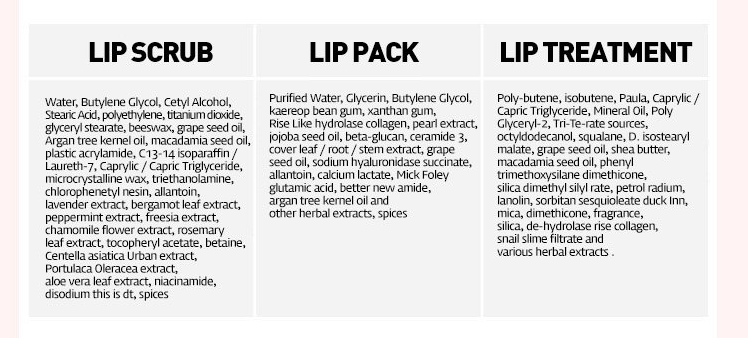 SR makes not only a lip scrub, but a lip mask and lip balm. Here are the ingredients for all three, from the listed website, warts and all in the translation. Memebox gave some bad information here.
