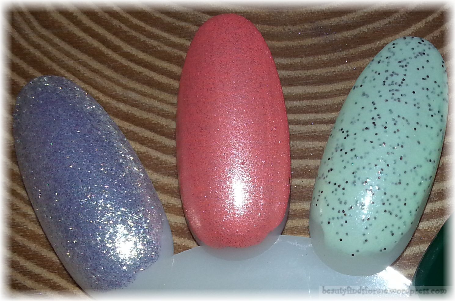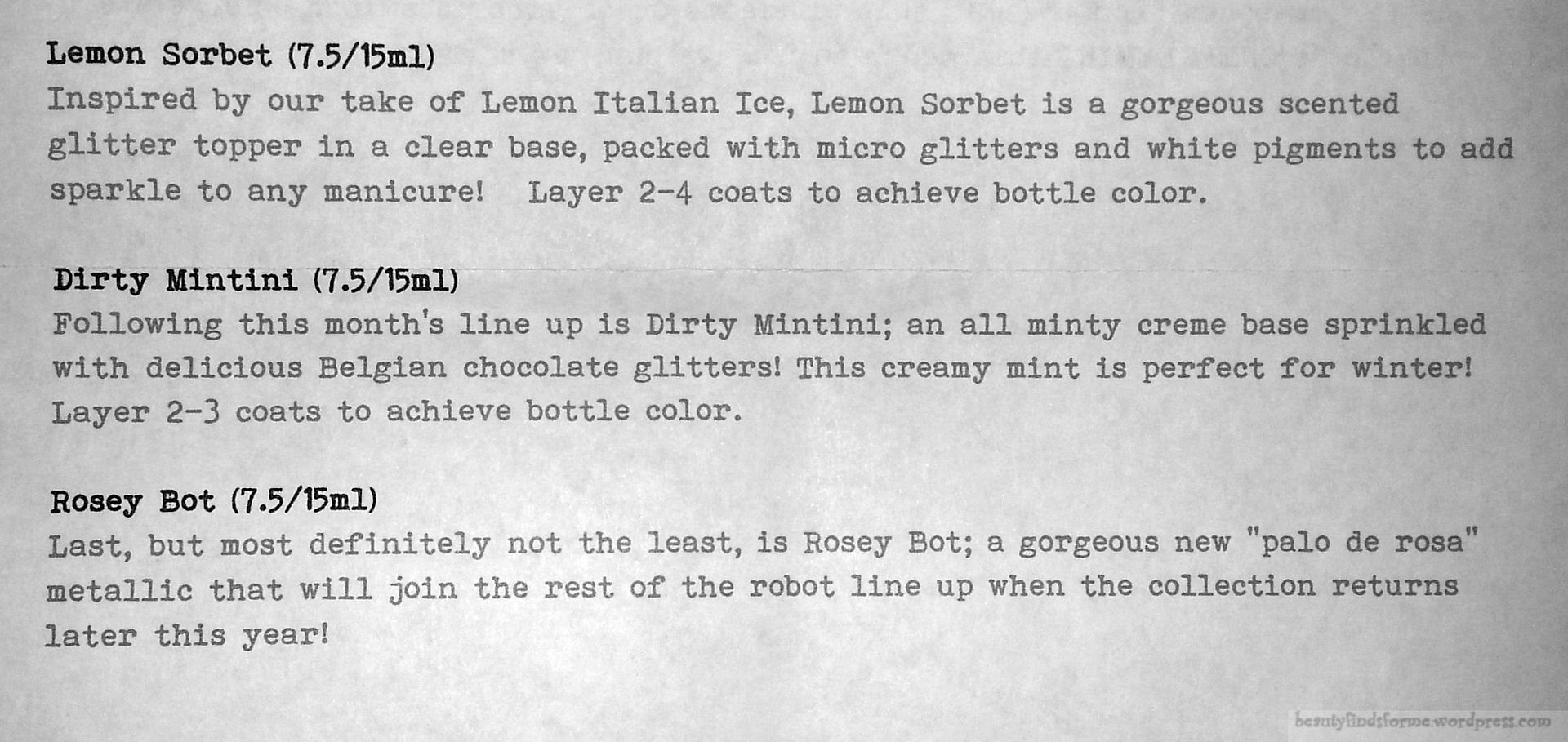 Lemon Sorbet (7.5 mL) ~ Inspired by our take of Lemon Italian Ice, Lemon Sorbet is a gorgeous scented glitter topper in a clear based, packed with micro glitters and white pigments.  This is my favorite color of the 3;  in fact, the only one I will wear.  The swatch does not do it justice, it is an icy glitter with a rainbow of pink and light green iridescence.   It comes off as lavender in the swatch, but it truly is a white ice-pale topper.   What you see in the picture above, with the polish in the bottle, is more representative of the shade than my swatch.  I love this shade and despite my “I don’t need nor want any more nailpolishes”, when this comes out in full size, I will purchase it.