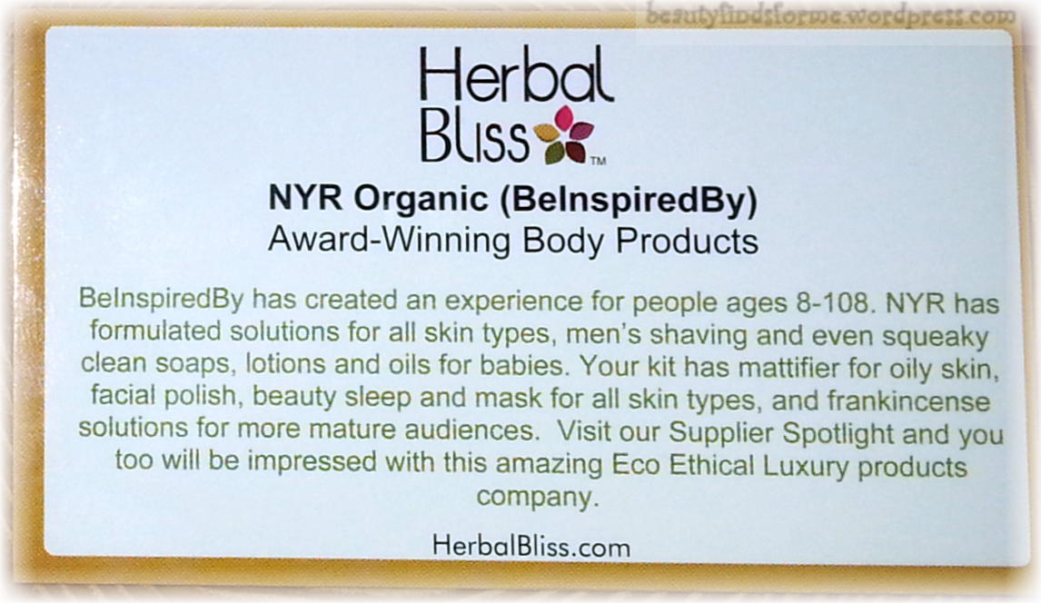 Description: NYR Organic/BeInspiredBy) generously assembled sachets of their Award Winning Products created to be an experience for humans 8-108. NYR has formulated solutions for all skin types, men’s shaving and even squeaky clean soaps, lotions and oils for babies. Your kit has mattifier for oily skin, facial polish, beauty sleep and mask for all skin types, and frankincense solutions for more mature audiences.