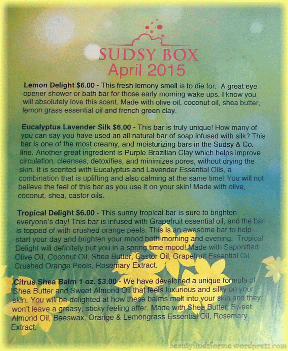 [ descriptions in italics from sudsybox.com and sudsyandcompany.com This box was paid for by me! ]
