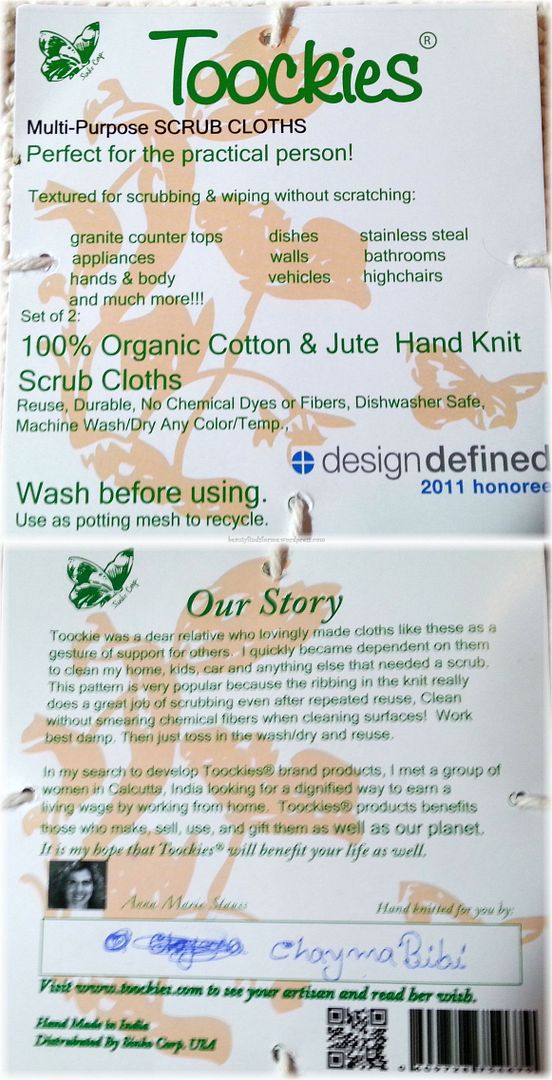 Description: Set of 2 Toockies® Brand multi-purpose scrub cloths that are hand knit out of certified 100% organic cotton and organic Jute. They are ribbed for deep scrubbing without scratching any surface be it smooth, soft or textured with amazing scrubbing results. The jute cloth is more abrasive providing extra scrubbing power. The knit pattern is perfect for scrubbing stainless steel appliances and glass stove tops, counter tops, dishes… Certified 100% Organic Cotton and Organic Jute and Hand Knit. Vintage Dish Cloth Patten with a punch! Much stronger and denser than regular cotton. Deep Scrub without scratching counters, leather, stainless steal, textured walls and exfoliate skin Not intended to be absorbent. Bleach as needed. Wash with any color or temperature, no folding, just stretch slight shrink and curled ends, stack and reuse. Biodegradable. Natural Cotton Color. No chemical dyes and not chemical fibers. Fair Trade Members- products benefit those who make, sell, buy, use, and gift them. Signed by artisan Easy to use they work best damp…just place under running water. roll like a carpet, double over, twist hard and strain. They out perform and out last other scrubbers because they can out last for years of frequent use. MORE HYGIENIC than sponges and plastic scrunchies because they machine wash/dry after use to refresh. They will work hard for you! For the practical person they save time & money while doing the job in your home, socially and environmentally.