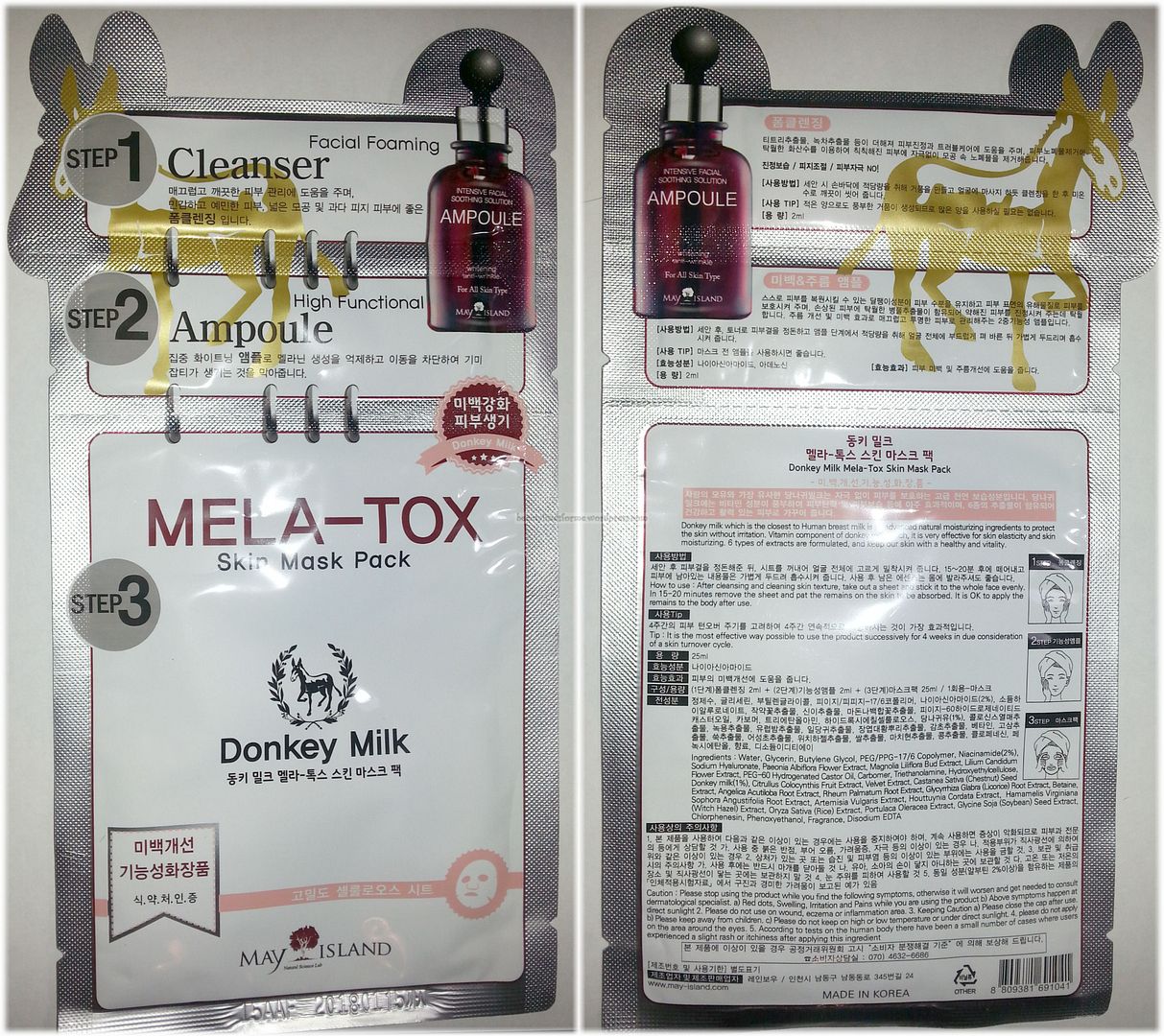 May Island Donkey Milk Skin Mask Pack in Mela-Tox and Aqua  Mela Tox is the whitener/brightener mask and Aqua is a firming, moisturizing mask.    These are randomly selected from the May Island Donkey Mask series, and I have seen the Wrinkle Filler in some other customers bags. The May Island mask packs include 3 separate sections:  a cleanser, which you will use to wash your face first.  Then an ampoule, to apply on your face before you open the 3rd section, which contains the mask.     This is pretty cool, not because of the donkey milk, but because this mask has 3 parts to it!   I am excited to try these out, especially the Mela-Tox.   The package doesn’t seem to have the ingredients for the cleanser or ampoule, so I have no idea what is in those two foils.  The ampoule is the May Island Anti-Wrinkle/Whitening ampoule, so I guess I will have to hunt that down to get that ingredient list.   2 masks Value $6.40