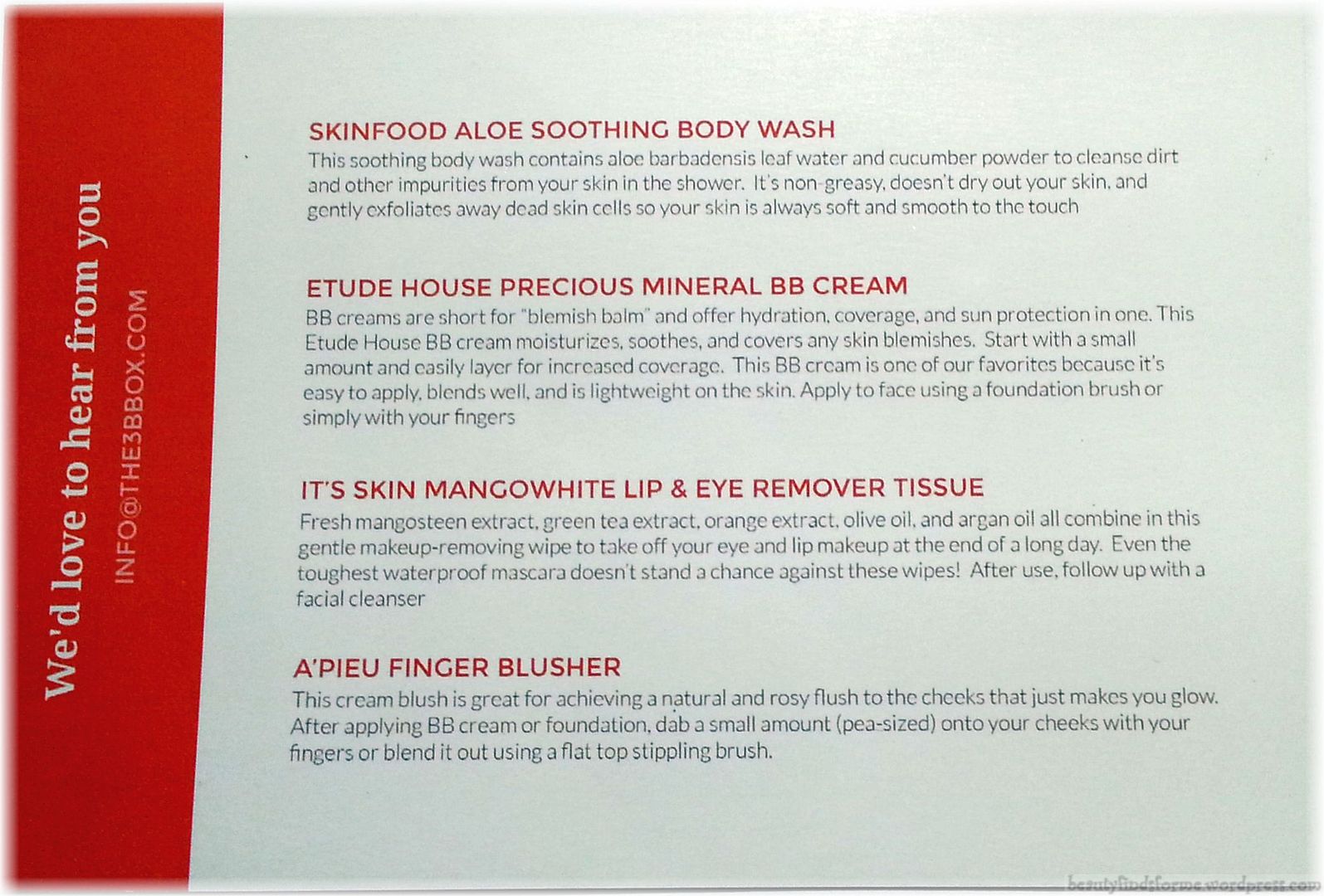 I am really loving The 3B Box, as it gives me good sized samples as well as some full sized products that will give me a “taste” of some Asian beauty products that I haven’t tried before. What is 3B (Beauty Beyond Borders)? It is an Asian sample monthly subscription box and is very affordable at $12.00/monthly. It is similar to ipsy and Birchbox, where you get 4 to 5 deluxe samples (and sometimes a full sized item!)