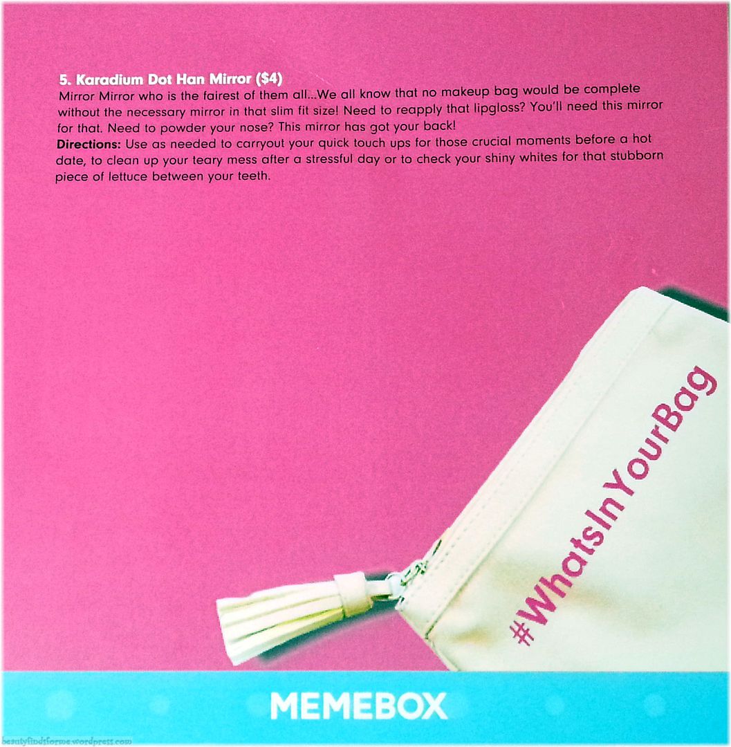 Karadium Dot Han Mirror This is a cute little mirror with a black & white poka dot fabric on one side and the mirror on the other side. The only problem I have with this mirror is that there is nothing protecting the mirror ~ it will get all scratched up. I wish this was more of a compact mirror to protect it. It is very cute and I guess I will have to keep it at my desk, because being in my purse will guarantee that it will get damaged quickly. Karadium is a Korean makeup company and I wonder if Memebox will start carrying that brand soon. Value $4.00