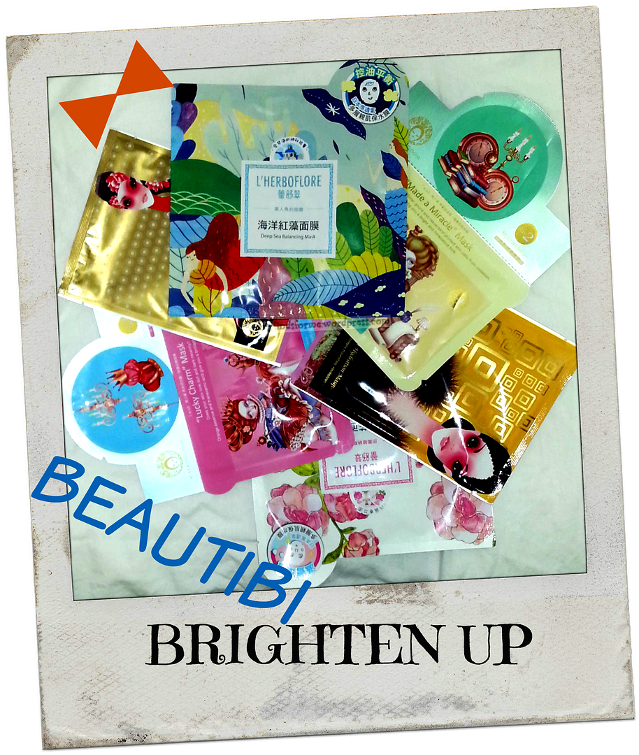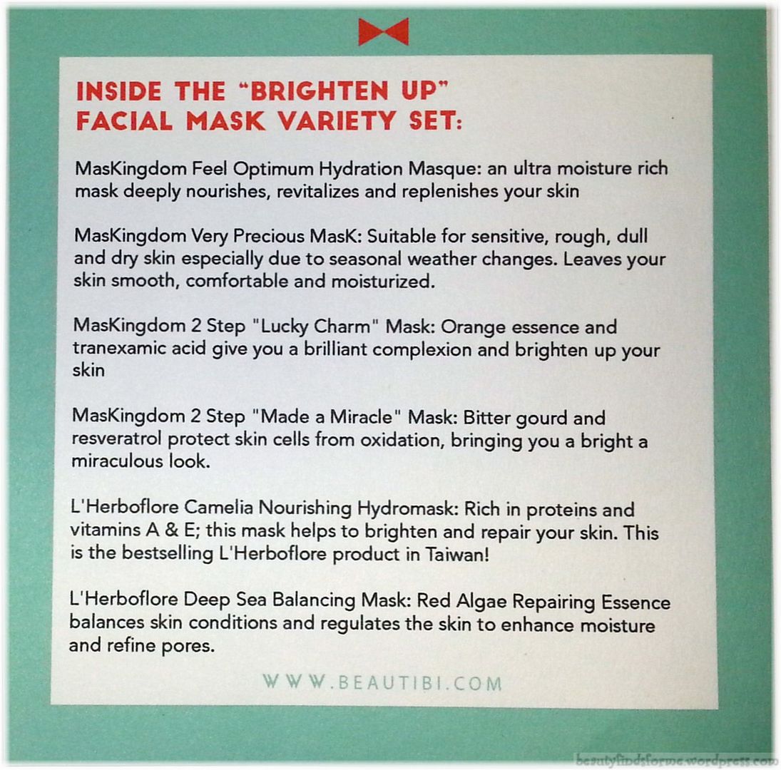 I have to say, these are some of the prettiest and unique designs for facial sheet masks that I have seen ~ Roarin’ Twenties/Art Deco vibe and  beautifully drawn Fairy Tale type of images from MasKingdom and L’Herboflore’s botanical print and deep sea oasis drawings.  Just looking at the mask packages was half of the fun!  This box certainly delivered with the “Brighten Up” theme ~ all of these masks have ingredients to help even out and brighten your skin tone, as well as targeting other issues, such as pores, hydration, healing, soothing.  I hope that Beautibi does more mask boxes ~ I would love to see more L’Herboflore masks at their site, after looking thru all of the different varieties offered ~ they have an Oriental Herb and foodie masks – the black tea and cocoa ones look interesting!