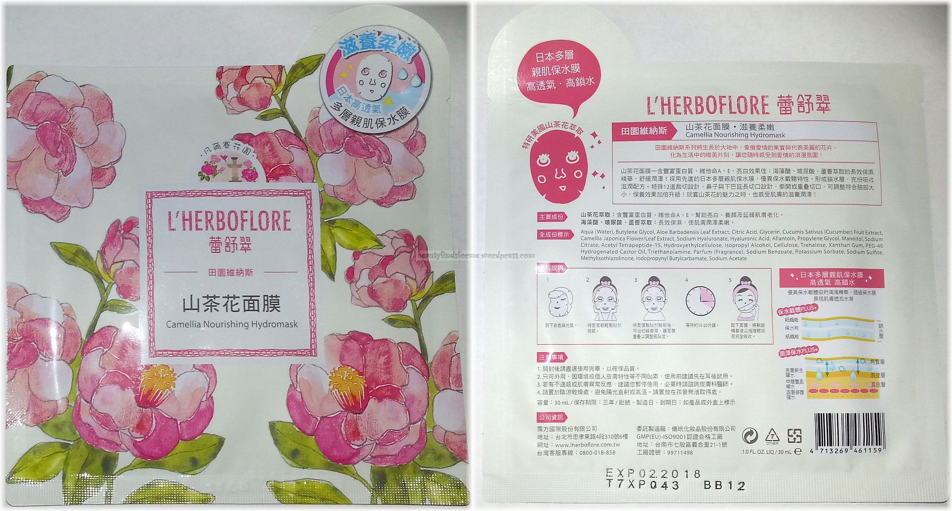 L’Herboflore Camellia Nourishing Hydromask    L’Herboflore is brand new at Beautibi and also to me as well!  The Camellia mask is from their Garden of Venus series, which is floral inspired.  The two I received are hydrogel and they are ONE piece!  Yeah!  If I have to use a hydrogel, I like a one piece as it actually stays on my face ~ two piece hydrogels always have the lower section just sliding down and off my face 😦  .  Value $4.00