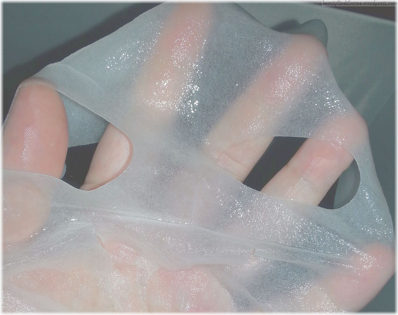 I did use this mask and found it very cooling and refreshing.  The silk sheet was a very good fit on my face and there was essence still in the bag,  so I smoothed that over the mask and on my neck.   You can see how wet the mask is right out of the bag in the photo below.  After 15 minutes passed, I removed the mask and my skin was still moist.  Once my skin dried, it felt smooth, soft and very hydrated ~ no oily or greasy residue.  I was hoping that the mask would be gold, like the package displayed, but it isn’t gold ~ just a standard white mask color!