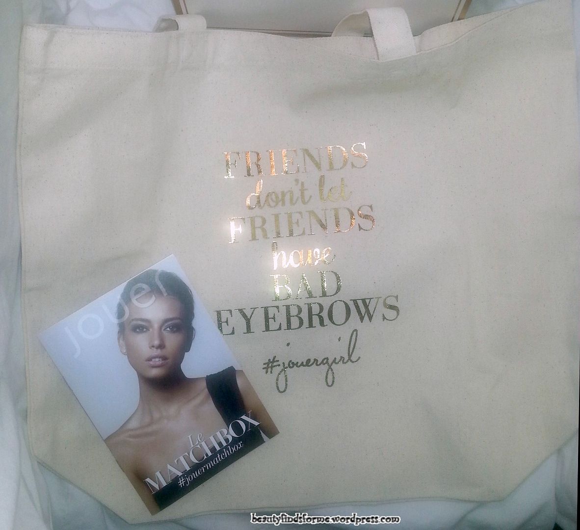 Jouer Tote Bag I love the material and the size of this bag ~ very sturdy and practical. What I dislike is the saying on the bag ~ haha. WTF? Seriously, I don’t judge people by their eyebrows and never understood the obsession with making ones brows look so fake with brow products. There were other nice sayings, like the happiest girls are the prettiest girls, which I would have liked better. I hope this saying fades over time or maybe I will turn this bag inside out, as I am kinda embarrassed by that saying. I do love the bag itself, just not the caption on it ~ this is, so far, a Jouer exclusive to Le Matchbox subscribers, as it isn’t sold at their site.