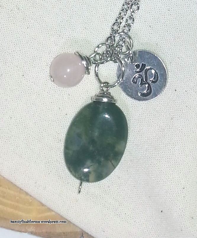 Green Tree Agate & Rose Quartz Om Necklace This was our spoiler and I am surprised to find that such a delicate necklace has such presence. This is a charm necklace and all three pieces are removable from the 27 inch chain. The stone pieces are capped with a round wire textured top. The rose quartz ball is a delicate shade of pink and it works very nicely against the forest greens of the tree agate oval slab, which is opaque with mossy-fern designs of the green working its way through the stone. The OM symbol is the 3rd charm that dangles from this necklace. All in all, this is a really lovely piece and I love the pink and forest green together! RV $45.00