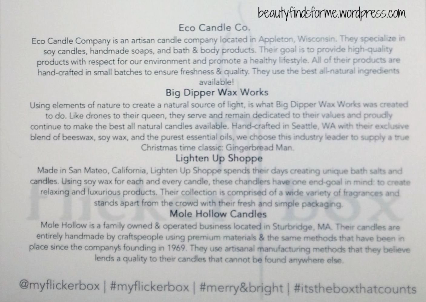 Each Flicker Box contains a variety of artisanal candles made from candle artists from around the United States. We share their story and ship subscribers a delightfully curated box right to their doorstep. Flicker box costs as low as $25/month and can be purchased as an automatically-renewing monthly subscription or 3, 6, or 12 month term subscriptions. from http://myflickerbox.com/about