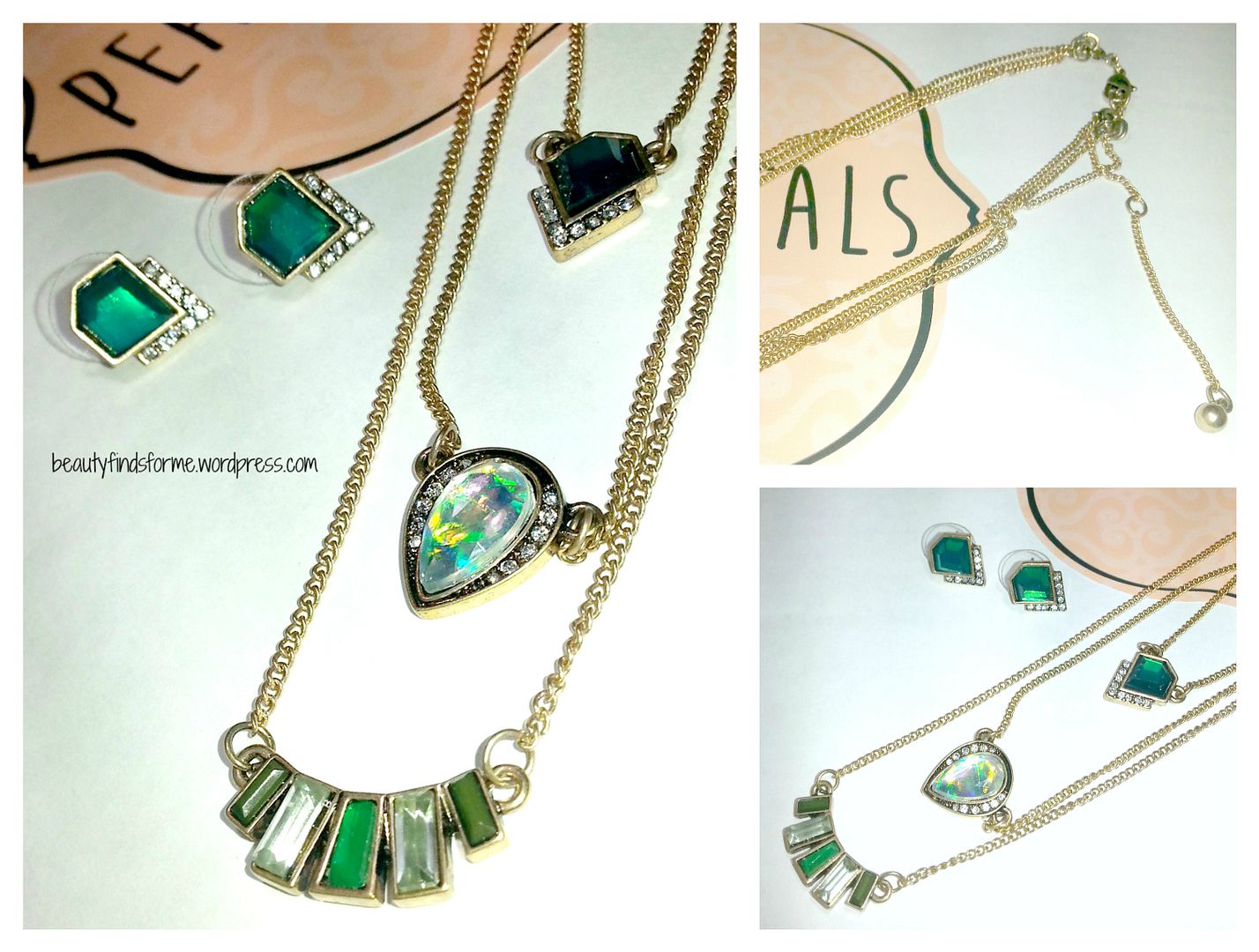 Art Deco Inspired Emerald Green Necklace and Earring Set I know that Peaches & Petals didn’t say Art Deco, but it is very much an Art Deco Inspired design. This is such a great set! I love the deco inspired look, which was so popular in the 1920’s and 1930’s (think of the Empire State Building) and there are multiple shades of green. The irregular pentagon shape in both the pierced earrings and one of the pendants, is a beautiful rich dark emerald green with little round “diamonds” flanking the 2 bottom sides. The teardrop pendant is more of a opalescence green with flashes of pink, blues and golds and has those “diamonds” flanking the oval. The bottom pendent has graduated rectangular “gems” in that same rich dark emerald green, matte forest green and an olive green.