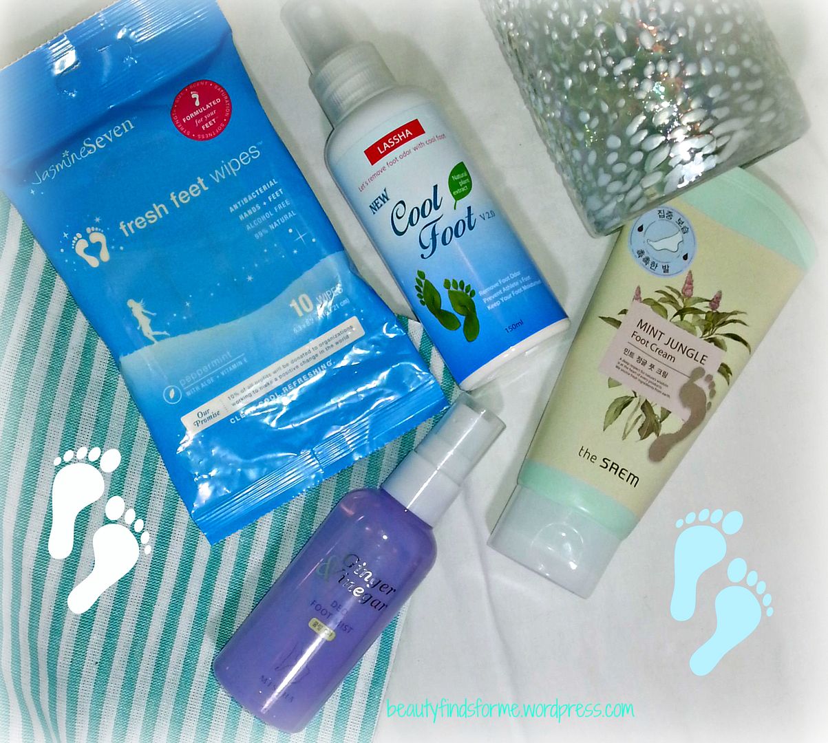 Warm weather means one of 3 choices for your feet ~ barefoot, sandals or shoes with hose or socks.  Either way, your feet are going to get dirty and sweaty.  Here are some of my favorite products to clean and refresh your feet. Jasmine Seven Fresh Foot wipes are cooling, refreshing and smell minty!  I keep a pack of these at my desk at work because sometimes I walk at lunchtime and it is dusty and dirty out there.  These help quickly wipe away any dirt, sweat and oil on my feet, dry quickly and give my feet a tingling cooling sensation.  Moisturizing too, as they have aloe and glycerin ingredients ~ you can also use these for your hands or anywhere else you need to clean off and cool down!   Foot sprays!  Love them ~ you can make your own too ~ just toss some witch hazel, rubbing alcohol and some drops of a minty essential oil (spearmint, peppermint, wintergreen..), some tea tree, citrus and rosemary essential oils in a small spray bottle  and you have a refreshing, cooling and antibacterial foot spray.  If you don’t have time or the ingredients, there are many foot sprays out there ~ I personally love Missha’s Ginger Vinegar Deo Foot Mist  ~ ginger lily, neem, lotus and fermented ginger ~ can’t get better than this ~ it doesn’t smell like vinegar at all (it does have a strong initial alcohol scent),  and it is very refreshing on my feet, plus it deodorizes.   The Lassha Cool Foot spray is another one I really love ~ full of herbal and citrus oils, but I cannot find it online and I am down to the last drop.. If anyone knows where I can get that, let me know in the comments 🙂