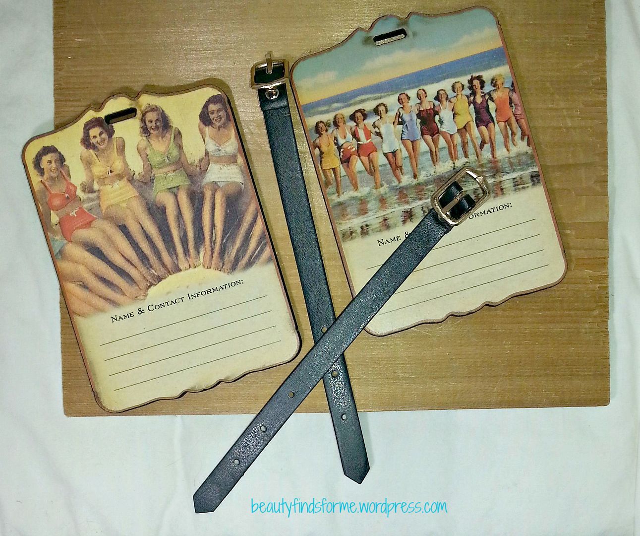 Floating Circus Bag Tags in Beach Girls This is my “Beachy Surprise” and these bag tags are wooden tags that tie on with a leather strap. They are very vintage looking, both in design and in art ~ this is the beach theme and looks to be from the mid 20th century, around 1940 to 1950. There are 2 tags and they measure about 3 x 4.5 inches. These are really nice and I will use them to identify my luggage ~ they are very unique and big! RV $12.00