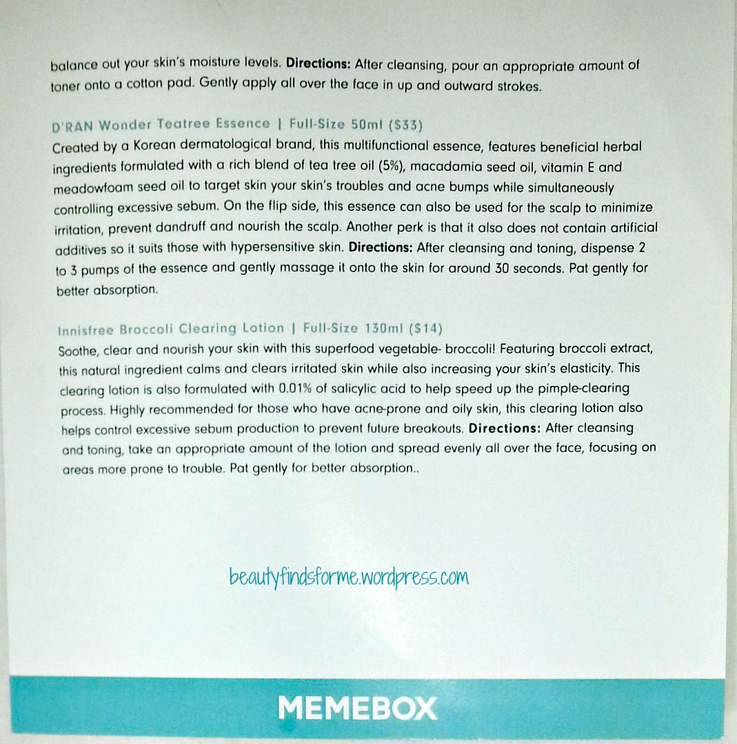 This is an excellent box even though the facial cleanser is now a body cleanser ~ haha. I do think that the MemeValue is over inflated here ($79.00), but since I will use all of the products, I find that this was a good price at $35.00. I love Innisfree and D’ran, plus I am truly exited about trying out the Papa Recipe product. The Acne Skincare box is out of stock right now, but there are a couple of boxes at Memebox that would be really good for oily and blemish prone skin