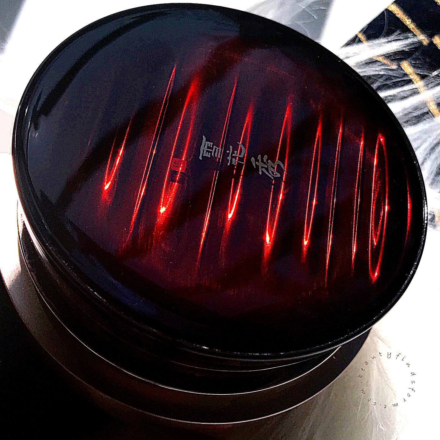 Again, lots of ingredients but this is a premium anti-aging sleeping mask pack ~ this comes in a beautiful bronze-red squat tub with a beautiful and I mean, just stunning cap. You have to see this in strong natural sunlight to really appreciate it ~ the top of the flared cap has two layers ~ the top layer is just a normal smoky brown color, but underneath that, you see a rippling design that is an amber red color. Once the light hits that lid, it flashes red and looks like a light has been turn on inside the lid. Yeah, I am geeking out over a lid! hahaha. This mask pack comes with a BRUSH to apply it ~ seriously a BRUSH. I am a heathen and use my fingers.