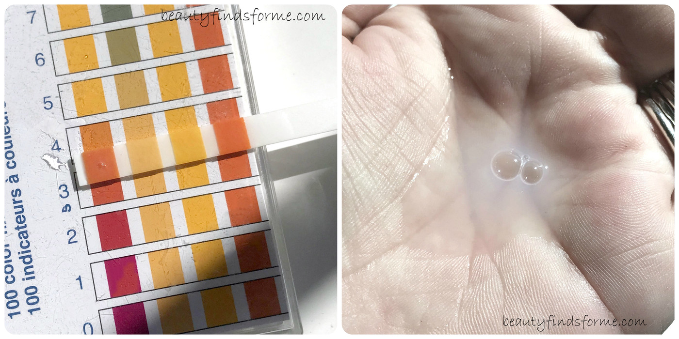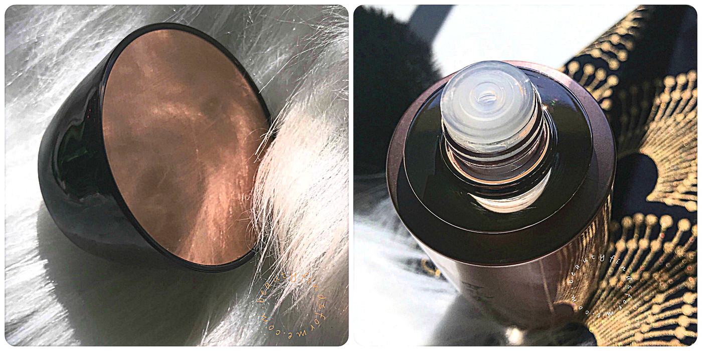 This comes in a beautiful red-bronze glass bottle with bronze-red cap with a red-bronze mirrored top. I know some people will describe this as rose gold, but I see it as much more rich and deeper than rose gold ~ bronze-red. This has a pin hole applicator and the “water” is this light-milky looking liquid that is quite watery. This has a slight herbal-floral scent, which is okay ~ I was hoping for pine or ginseng, but it fades quickly. This has a pH level of a 4, so it is mildly acidic but it is not irritating at all.