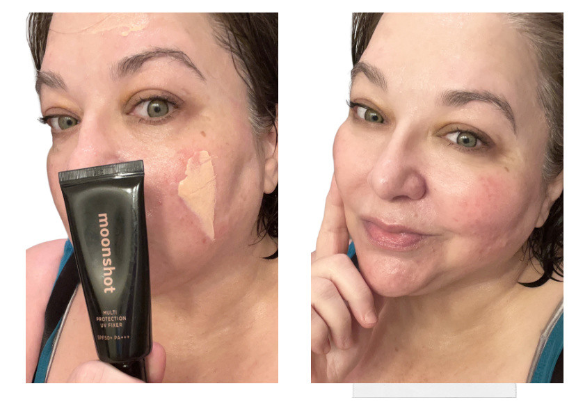 Tone Up Fixer SPF 50+ PA++++ is a tinted sunscreen makeup base ~ aka primer. It has SPF50+ PA++++, due to the UVA/UVB filters of minerals zinc oxide and titanium dioxide, These two ingredients also put the “up” in Tone Up ~ this is a brightening product ~ not that it will, over time, lighten dark spots, but it will physically and temporarily brighten your skin. This does have vitamin C ascorbyl palmitate, but it is really far down the list and is not a key ingredient that Moonshot promotes with this product. This does have a lot of moisturizing ingredients, such as squalane, jojoba oil, sunflower seed oil and antioxidants vitamin E, along with hydrating humectant fructose that binds water to your skin. Carotolino is a compound of carrot root, carrot seed oil, beta-carotene and canola oil, which helps neutralize free radicals formed by blue light. The silica and ‘cones helps keep this product smooth on the skin. This is a cruelty free product.