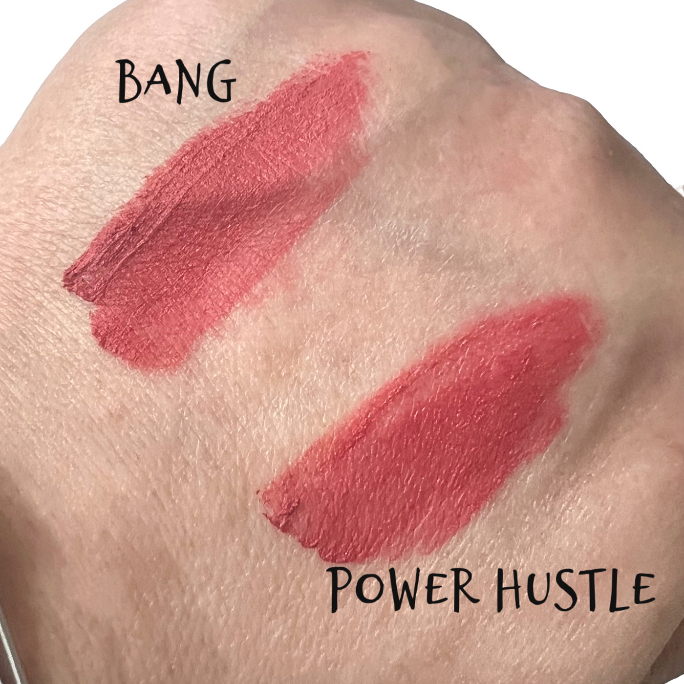Bang (06) is described as a neutral-tone vintage rose color, which I will admit, it does pull more rose tones than Power Hustle. It still has a peachy core, though, and quite frankly on my lips, they look WAY too similar. For some reason, these shades were very difficult to photograph properly. I would say both Power Hustle and Bang run in the orange/peach category of reds and pinks. Power Hustle is very much warm toned, and I do feel Bang is also warm toned as well ~ although the peach-rose combination might work for cool tones, as it is not as orange.