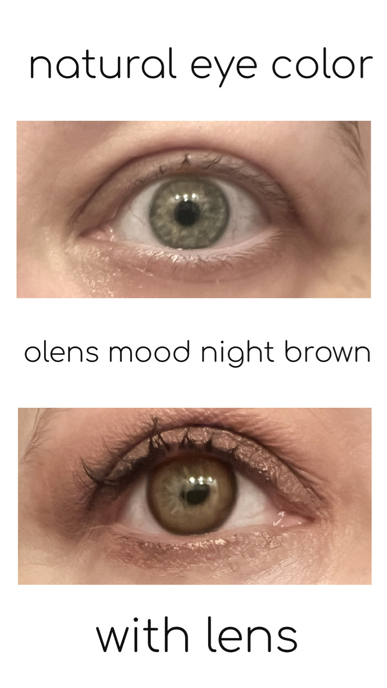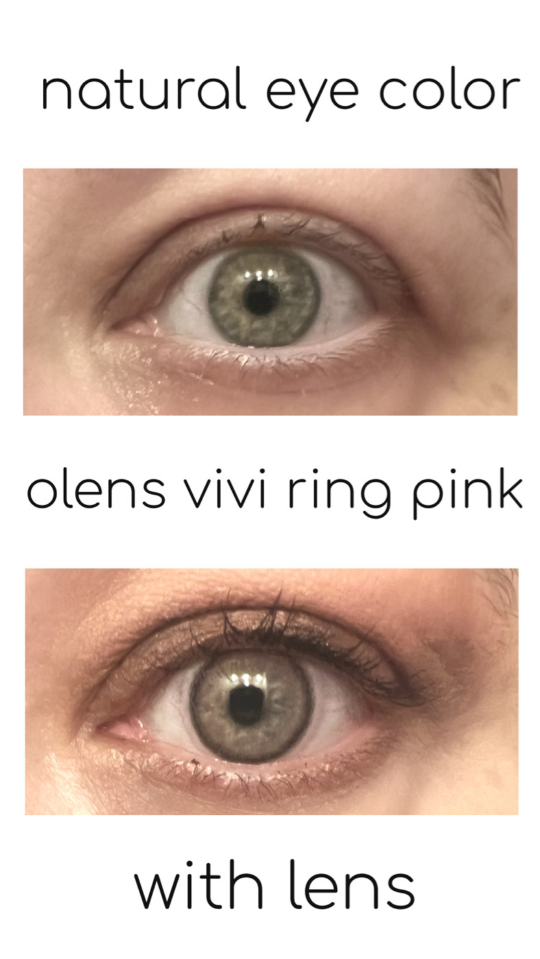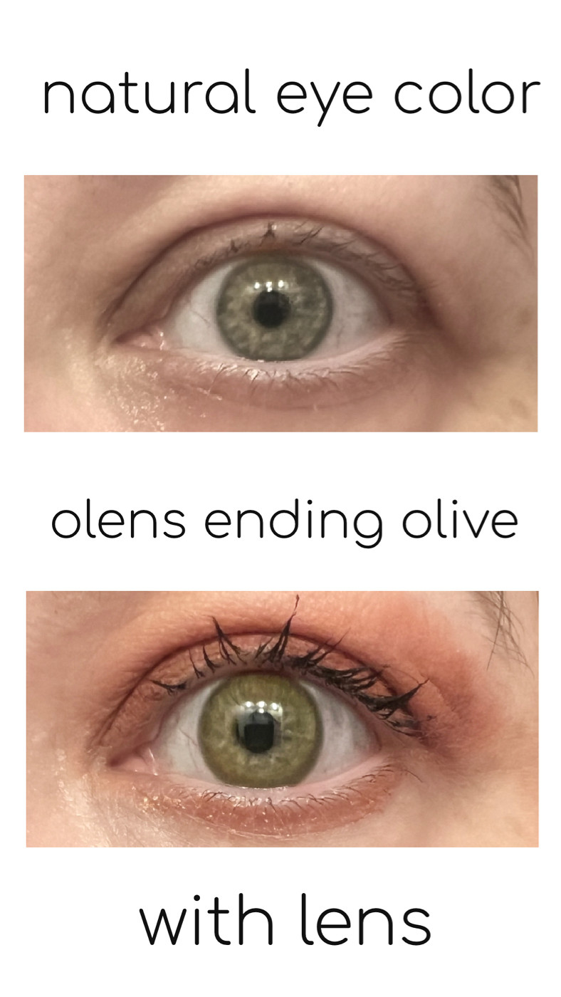 This is a new line for me in the OLENS family. I really love these ones a lot ~ they are so comfortable and the olive shade enhances my green eyes. The color is a soft, bright olive with a has a defined, thicker outer edge(the limbal ring) that is a dark olive in color. These are really nice and makes my eye color pop.
